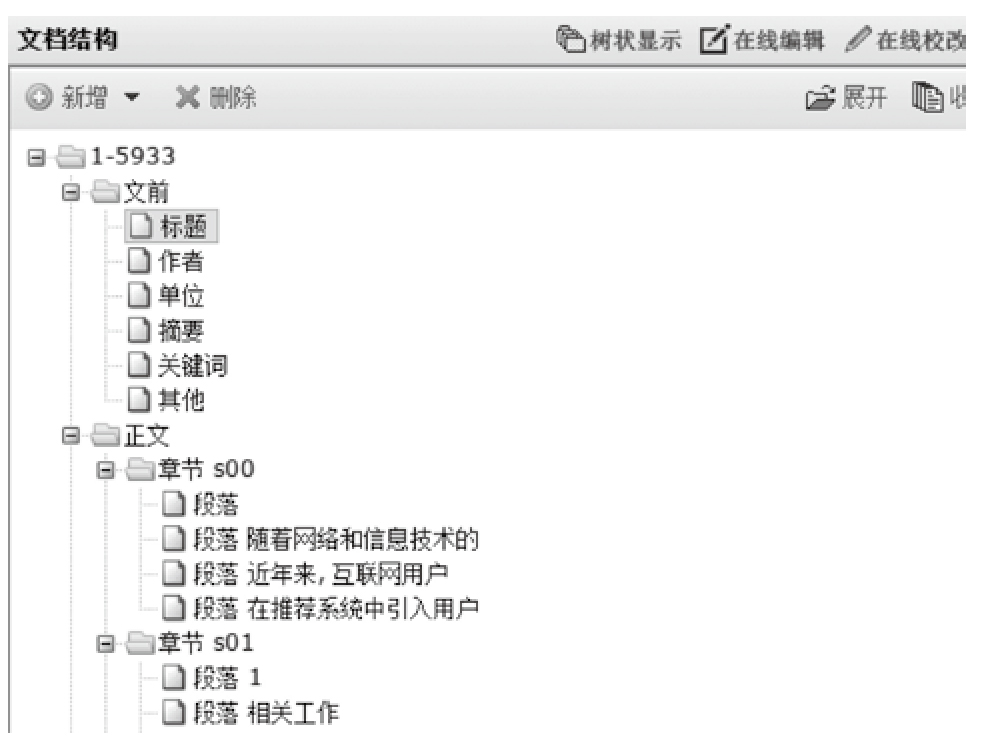 XML排版是一种结构化的排版方式,而在线排版系统会将文档的结构展示给编辑人员,如图2所示。因此,编辑校稿的时候可以按照标签逐一校对,既方便高效,又不易出错。
