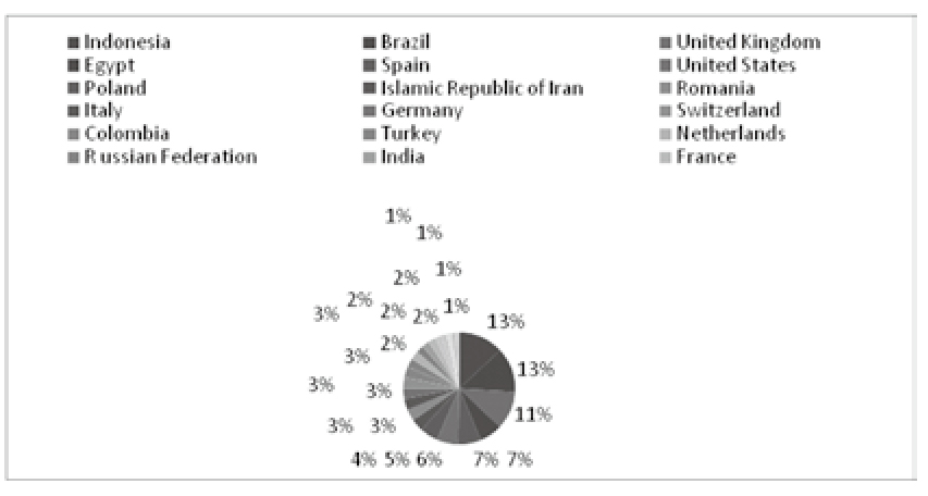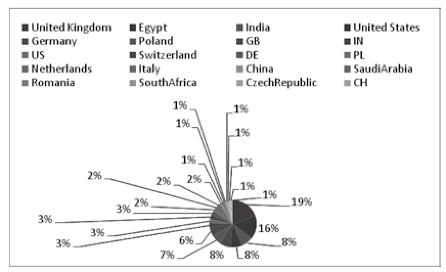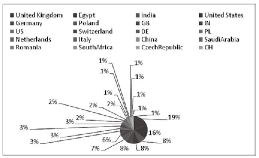 截至2018年1月,DOAJ已经收录121个国家或地区的10 737多种期刊,GoOA收录了67个国家或地区的2 525种期刊,因期刊所在国家分布较广,笔者选取前20位进行比较研究。其中,期刊国家指的是期刊出版商所在的国家或地区。从图1中可以看出,DOAJ收录的期刊中,印度尼西亚、巴西、英国、埃及、西班牙、美国、波兰所占比重最大,分别是13%、13%、11%、7%、7%、6%、5%;印度尼西亚期刊成为DOAJ平台占比最大的期刊群。这主要得益于2016—2017年运营的“代表项目”,这一项目被加拿大IDRC(加拿大国际发展研究中心)资助,旨在提高南半球国家和地区的开放存取意识,提高国际出版水平。2016—2017年期间DOAJ派出12名代表前往印度尼西亚和韩国等国家推广其网站,使得近年来DOAJ中相关国家的OA学术资源剧增。由图2可见,GoOA期刊出版商所在国家或地区所占比重依次是,英国占19%,埃及占16%,印度、美国、德国相同均为8%,波兰占7%。由此可见,DOAJ和GoOA在国际传播目标市场的定位上存在一定的差异。