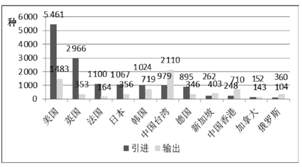 由图4可知,我国出版业进行版权引进的主要国家或地区包括美国、英国、法国和日本等,而版权输出的国家或地区主要是中国台湾、美国、中国香港和韩国等。同时,反映我国出版存在较大的版权输出逆差,说明我国出版业版权输出发展严重滞后。