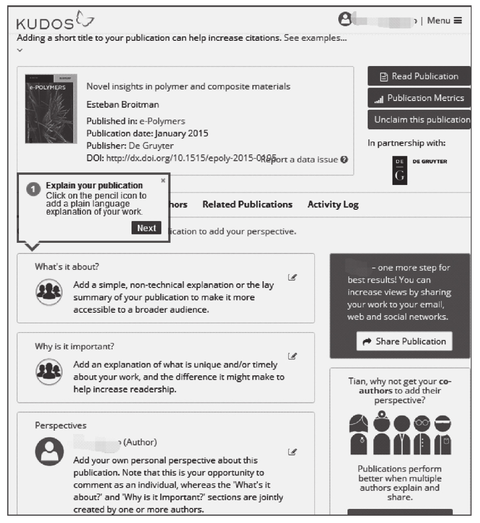 Kudos是一家致力于提高科研成果学术影响力的平台。作者通过免费注册使用kudos平台,对已发表的文章进行描述充实后,将生成的链接分享到社交媒体(Twitter、Facebook、LinkedIn)或者以邮件形式分享给其他研究人员,以扩大科研成果的学术影响力,同时可跟踪文章在各社交媒体的反馈情况。据Kudos提供的数据,作者通过Kudos平台对文章进行分享传播后,文章的下载量平均可提高23%。2014年成立至今,Kudos已有超过20万作者注册使用,与美国科学促进会、Taylor&Francis,Wiley等75家知名出版商建立了合作。2016年3月,清华大学出版社期刊中心与Kudos达成合作。