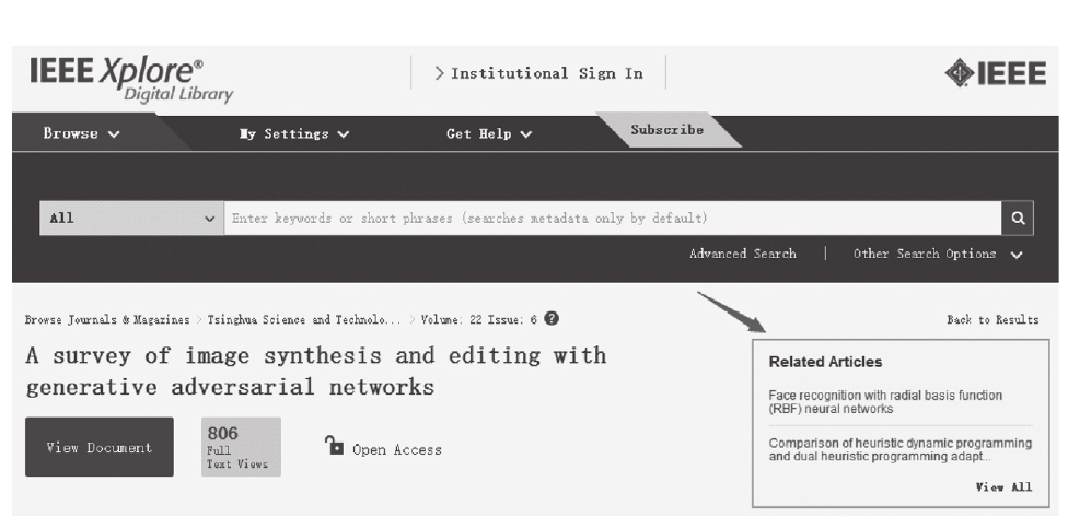 IEEE和Springer等数字出版平台也在文章页面提供了相关内容推荐版块,不同于TrendMD,这些平台只限于推荐本平台出版内容,并未实现文章的跨平台推荐,具有一定的局限性。如图4所示,IEEE平台《Tsinghua Science and Technology》的一篇文章[16]页面右侧为相关文章推荐(Related Articles),被推荐的文章均来自于IEEE自身的平台[17,18]。