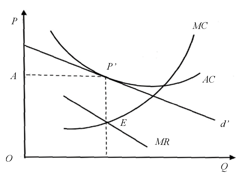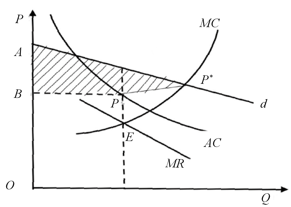 如图1,当边际成本曲线MC与边际收益曲线MR相等时,垄断企业总利润最大化,即图中MC与MR相交的均衡点E所确定的产量与价格。MC与需求曲线d相交得到的均衡点P*高于成本价格P,因此最大利润为正值的利润,企业利润即图中阴影部分AP*PB。我们可以假设出版企业让出一部分利润给经销商,给书商一个有竞争力的折扣,需求曲线会向右下方倾斜,与平均成本曲线AC相切于点P’,如图2所示。
