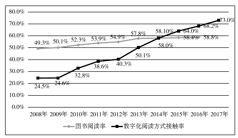 从2008年开始,由中国新闻出版研究院支持的全国国民阅读调查项目专门增加了关于数字阅读的相关调查。从调查结果来看,数字化阅读方式的接触率开始从2008年的不足四分之一逐年上升甚至超过70%,目前增幅几乎达到3倍,并已经连续三年超过纸质阅读率,2017年数字化阅读方式的接触率为73.0%,其增长速度之迅猛表现出新兴的数字阅读媒介已经呈现出蓬勃发展的势头,阅读趋势也将由传统阅读向数字阅读、终端阅读向移动阅读发展。