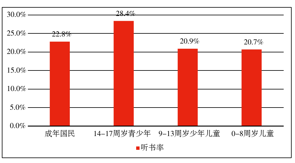 调查显示,我国成年国民的听书率为22.8%,较2016年(17%)提高了5.8个百分点。移动有声App平台已经成为国民听书的主流选择,这也跟近两年订阅语音知识节目增多、碎片化时间利用等密切相关。此外,0—17周岁未成年人的听书率为22.7%,与成年国民基本持平。具体看来,14—17周岁青少年的听书率最高,达28.4%;9—13周岁少年儿童和0—8周岁儿童的听书率相差不大,分别为20.9%和20.7%(见图4)。