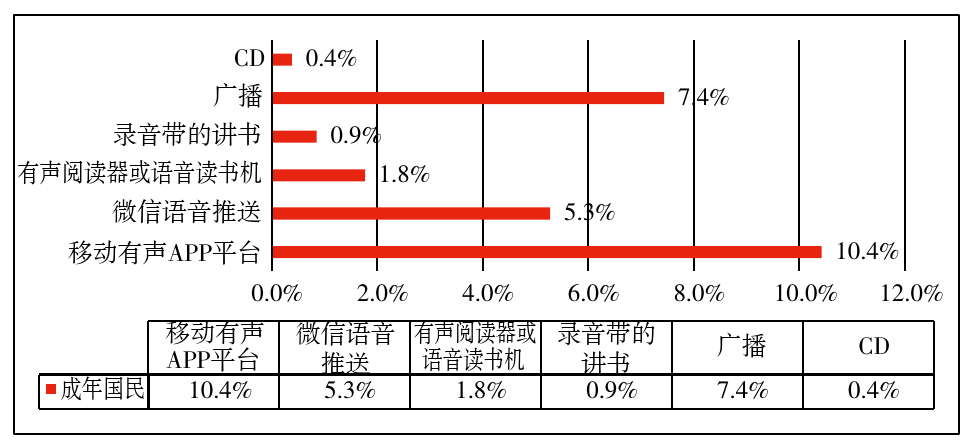 2017年我国成年国民的听书形式较2016年有着明显变化。选择“移动有声App平台”听书的国民比例(10.4%)比2016年的6.5%增长了3.9个百分点,选择通过“广播”听书的比例(7.4%)比2016年的8.4%下降1.0个百分点,选择通过“微信语音推送”听书的比例(5.3%)比2016年的3.6%增长了1.7个百分点(见图5)。