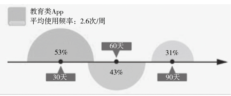 据统计,现在每天大约有1 000多个App被制作并添加到手机商城里,教育类App作为最受欢迎的三大App类型之一,占比仅为9.8%(其他两大类型为游戏类App占比21.8%,商务类App占比10.3%),其使用频次只有2.6次/周,能在手机上保留一个月的App也仅占53%[8]。教育类App使用频次示意图如图1所示。