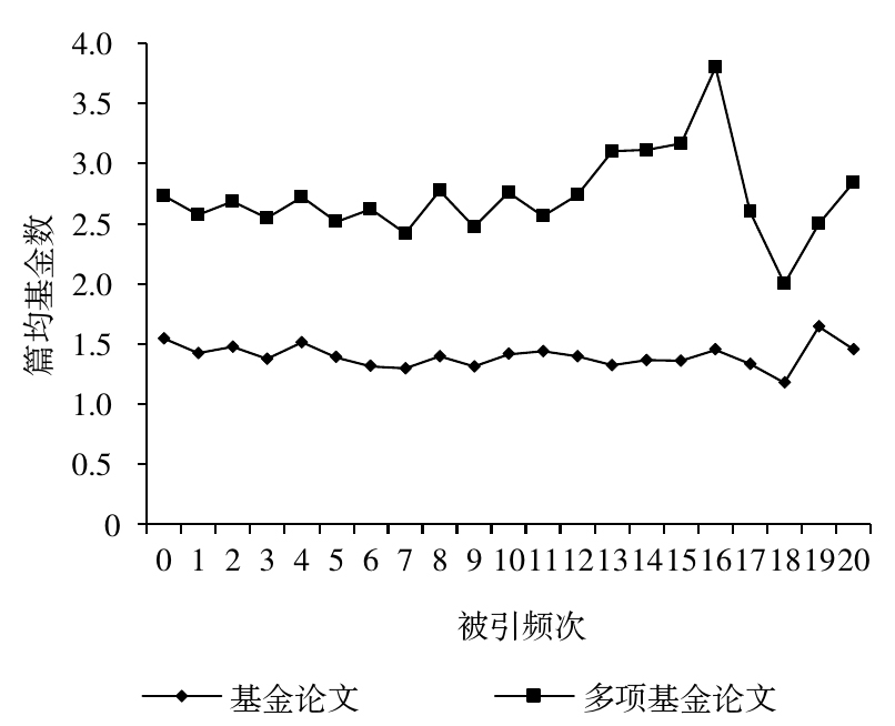 本研究通过文献计量学的方法,发现单篇论文基金数量与论文被引频次不存在相关关系,论文基金数量的增加并不会带来论文被引频次的增加。科学基金虽然可以提高期刊的学术质量,但多项基金论文对期刊学术质量的贡献有限,这与周捷[8]、梁志森等[17]、向丽和邱敦莲[5]的研究结果相同。这种现象可能由于以下原因:(1)多项资助情况存在各种形式,合作作者各自获得基金资助,不同国家、地区的联合资助,同一项目获同一机构基金连续资助均对研究有促进作用,而同一主题项目在相近时间段内获多项、多级机构资助,属于应该摒弃的多项资助现象[9],不同资助形式产生的科研成果的学术质量必然具有很大差异。(2)科技论文存在不实标注基金项目的现象[18],不实标注基金项目的论文质量较低[19],会降低论文的学术影响力和期刊的整体学术质量。(3)从多项基金论文的基金标注数量看,4项以上基金资助论文其学术质量明显降低,对期刊的学术质量影响最大。虽然科学研究中一直存在“马太效应”,但过多的基金资助是不太常见的。因此,一篇论文标注过多的基金资助其产生学术质量优劣“两极分化”的可能性很大。