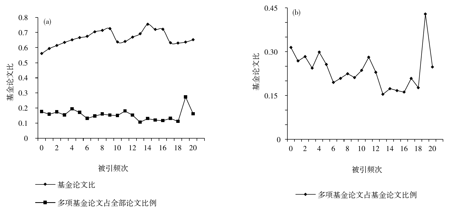 然而,通过被引频次与基金论文比的关系发现,基金论文比和被引频次成正比,基金论文比在一定范围内随着被引频次的增加而增加,但多项基金论文没有表现出这种趋势,多项基金论文占全部论文的比例并没有随着被引频次的增加而变化(图2(a))。研究不同被引频次多项基金论文占基金论文的比例发现,其随着被引频次的增加而减小(图2(b))。这表明论文的被引频次越高,基金论文的可能性越大,但是基金论文中多项基金论文所占比例越小。科学基金促进了高被引论文的产生,然而多项基金的资助并不能额外增加论文的被引频次,进一步提高论文的影响力。
