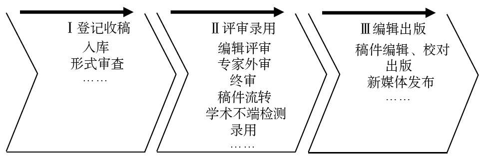 根据科技期刊出版工作实践,将编辑在科技论文出版中的主要工作可分为登记收稿、评审录用和编辑出版3个阶段,如图1所示。登记收稿阶段主要由编辑与作者互动完成,包括稿件入库、形式审查等内容;评审录用阶段主要由编辑与作者、评审专家交流互动完成,包括编辑评审、专家外审、终审、稿件流转和学术不端检测等内容;编辑出版阶段主要由作者与编辑互动完成,包括稿件编辑、校对、出版和新媒体发布等内容。