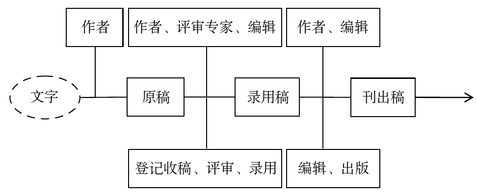 科技论文是由作者、评审专家和编辑组成的学术共同体的集体智慧的文字体现,从构思到刊出是一个复杂系统,如图2所示,人们以文字为流动要素进行思想交流。从现实特征看,科技论文在成稿后通过投稿的方式进入评审录用和编辑出版环节,直至最后刊出,论文的版式、内容甚至主要观点等经过上述环节后发生变化,其显性特征是刊出稿文字与投稿原稿和录用稿之间存在一定的文字差异,这与评审专家和编辑有着密切的关系。