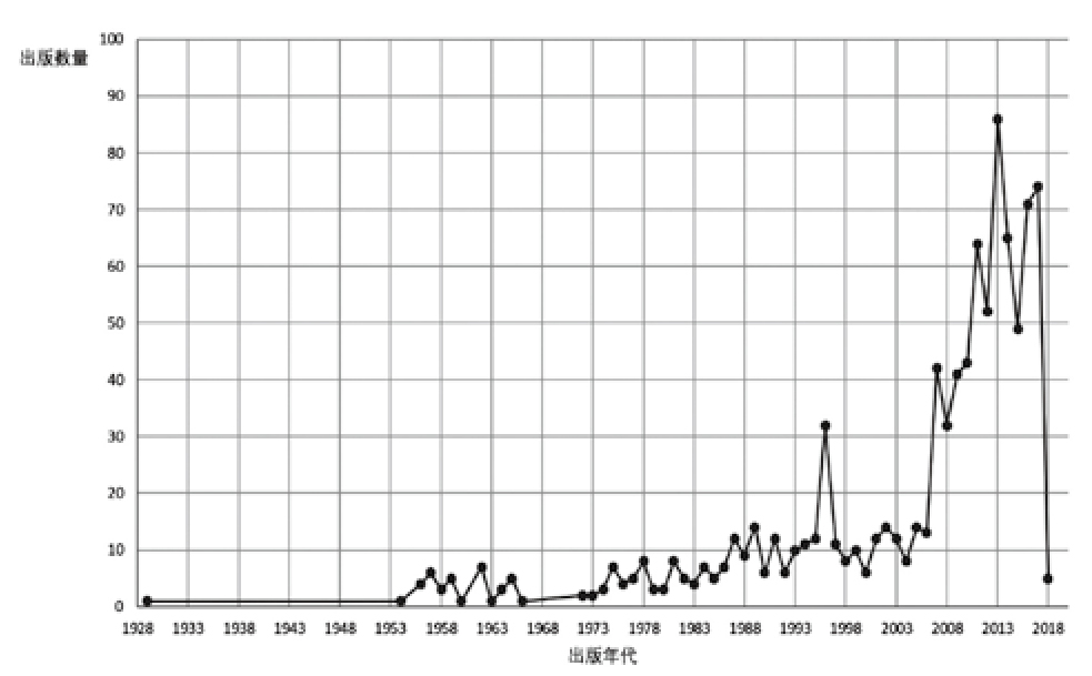 剔除掉10条没有显示出版年代或者出版年代存疑的图书后,南海主题图书的出版数量在不同出版年代的变化情况如图1所示。需要指出的是,2018年的出版图书数量仅有5本,这一方面是由于2018年的图书还在印刷出版中,另一方面图书馆对新书的著录入藏也需要一定的时间。
