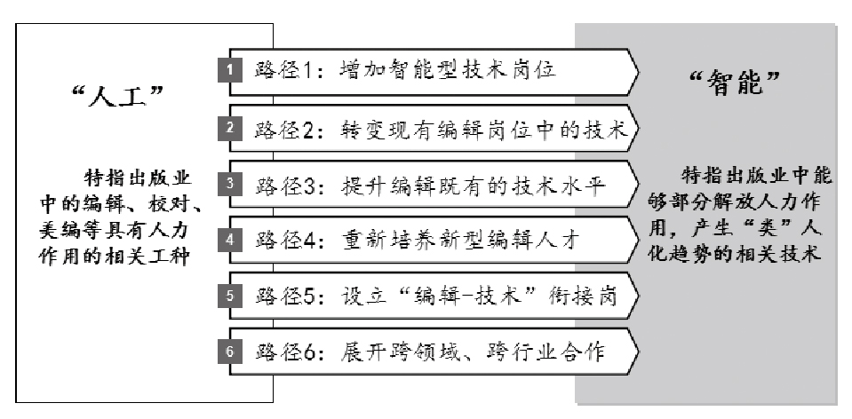 从图中可见,今天出版业中大量的“人工”面临着趋向于“智能”的转型:如增加软件工程师、云计算管理等相关岗位;要求编辑掌握数据分析、可视化制作等新型技术;配合智能作用,进一步提升现有的编校能力;或者重新确立诸如约定编辑(engagement editor)/拼接编辑(stitcher/VR editor)/社区编辑(community editor)等新型岗位;设立一些衔接岗,帮助编辑在人工智能浪潮中的过渡与适应;同时,鼓励编辑展开偏向于智能技术的跨领域、跨行业的相关合作等。