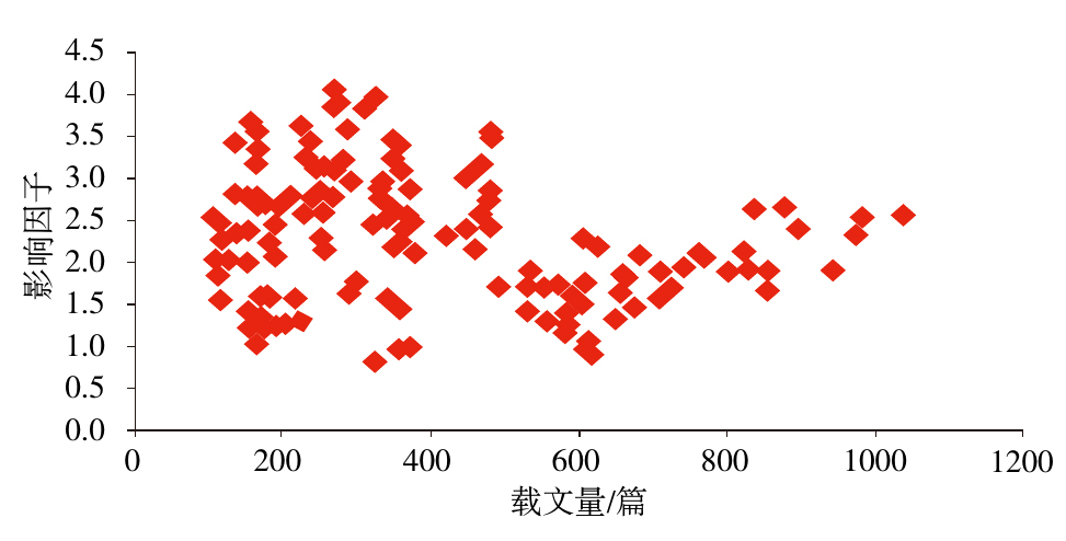 当期刊处于小规模(载文量为106~300篇)、大规模(载文量为700~1 070篇)时,呈现出期刊影响因子随载文量的增大呈现增大的趋势;但是,当期刊处于中等规模(载文量为300~700篇)时,影响因子随载文量的增大呈现出减小的趋势。