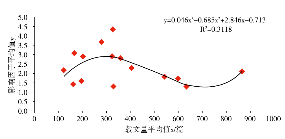 为了减少年际间差异对分析规律的影响,采用各期刊2007—2017年平均值建立影响因子与载文量间的经验模型。经多种模拟分析,最终得到期刊影响因子与载文量呈三次方函数关系(R2=0.31)(图2),模型通过检验,达到显著水平(P<0.1)。由拟合精度可知,影响因子约31%可由载文量决定。