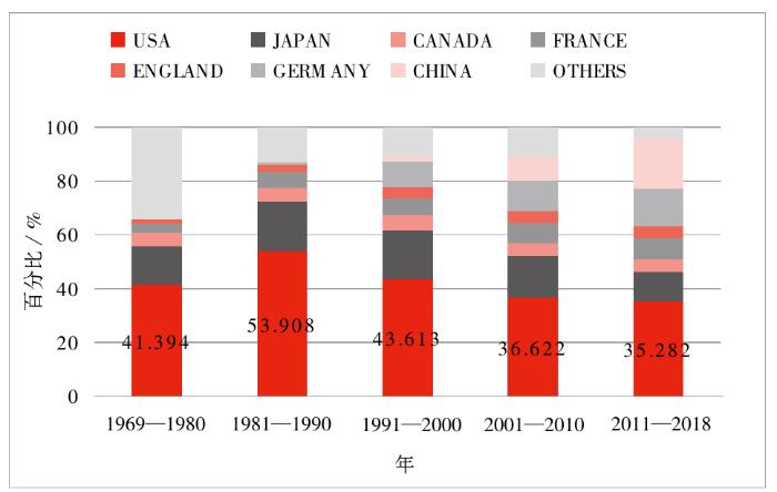 文章以JACS和Macromolecules单刊为例来分析美国化学会期刊的作者整体分布情况。JACS自1900年至2018年,主要刊登美国本土科研成果,但随着国际化学学科的发展,美国文章比例呈现下降趋势,由1900—1940年的95.63%减少至2011—2018年的38.70%(见图3)。这也说明JACS的国际认可度在提高,越来越多的国际科研学者为其投稿。改革开放以来,随着中国化学学科的发展,JACS上发表的中国科研成果的比例从最初的低至可忽略不计迅速攀升至第2位,如2011—2018年刊登中国作者的文章比例增加到11.70%。