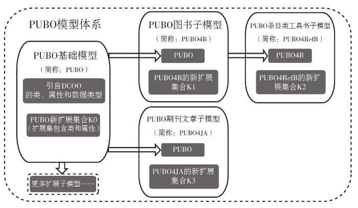 PUBO模型体系由基础模型及其子模型组成。目前,已扩展的子模型包括图书子模型(PUBO4B)、期刊文章子模型(PUBO4JA)以及扩展自图书子模型的条目类工具书二级子模型(PUBO4RefB)。PUBO模型体系结构如图2所示。
