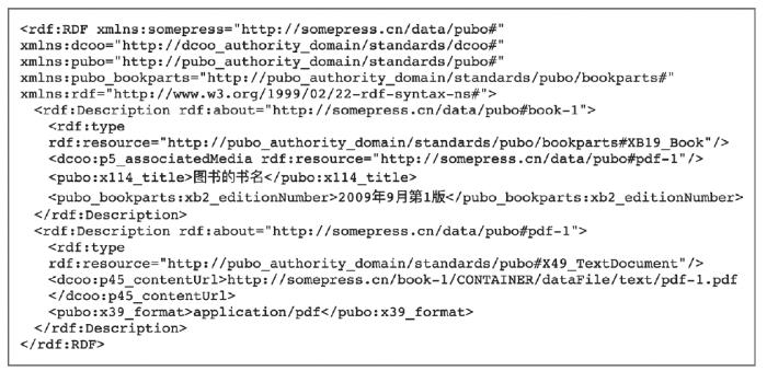 PUBO模型体系中,实例数据的命名空间取值由出版内容资源的加工或应用单位根据自身需求确定执行,通常可引入单位域名,如“http://单位域名/data/pubo#”。实例数据的本地标识符可参考数据在本地资源库中的存储标识来确定。