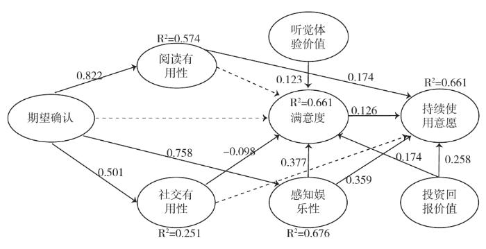 数据显示,在诸多影响因素中,感知娱乐性是影响用户满意度和持续使用意愿的关键因素,投资回报价值其次,说明用户在长期、持续使用有声读物App过程中,最看重有声读物App为其提供的愉悦感以及自己在其所投入的时间、金钱、精力上所产生的回报感。此外,满意度可显著影响持续使用意愿,验证了原模型中态度影响行为意愿的这一假设,但是其路径系数为0.126,影响力并不强。结合期望确认度对满意度无显著影响这一检验结果来看,其原因可能在于用户的总体体验并未达到预期,因而满意度并不高;或者是因为用户对感知娱乐性等单一因素的重视程度超过整体体验,产生的态度进而影响行为意愿,由此可推断,用户的态度的确会影响持续使用行为意愿,但感知娱乐性、投资体验价值、阅读有用性才是影响行为意愿的关键要素。总体而言,本文模型中持续使用意愿作为因变量的R2高达66.1%,具有较强的解释力。