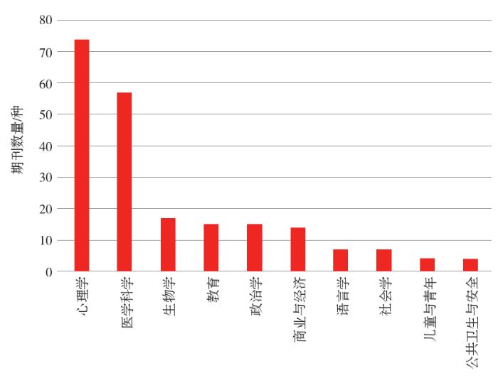为了更好地了解将注册报告作为常规投稿或特刊的221种期刊,通过《乌利希期刊指南》(《Ulrich's Periodicals Directory》)对221种期刊的学科进行分析,以更好地了解注册报告的期刊学科分布情况。《乌利希期刊指南》从1932年开始出版,收录了200种语言的15万个出版商的期刊资料,覆盖950个学科。[12]通过乌利希检索确定期刊所属学科,对期刊学科分布进行分析发现,采用注册报告的期刊共涉及36个学科,从图2期刊数量排名前10的学科可以看到,现有的采用注册报告的期刊主要分布在心理学、医学科学这两类学科,同时在生物学、教育、政治学以及商业和经济学科也有所发展。这说明随着注册报告的完善,其所涉及的学科范围也在扩大。