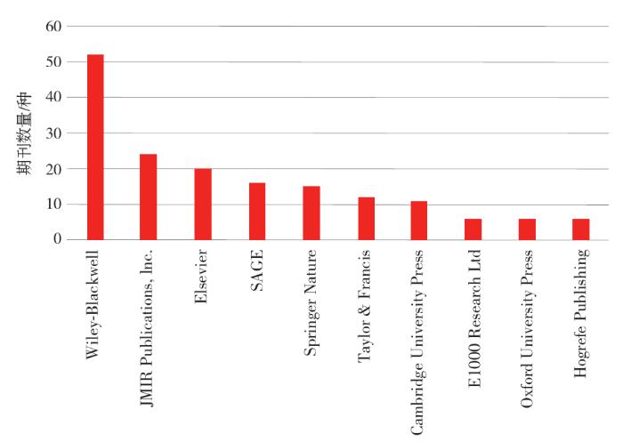 注册报告产生后,各大出版商积极回应,通过对现有的221本期刊的出版社进行梳理分析可以看到(图3),现有的注册报告主要分布在Wiley、JMIR Publications、SAGE和Elsevier等几大出版社,其中分布最多的是美国的Wiley出版公司,共有52种期刊采用注册报告,由Wiley公司采用的注册报告主要以心理学期刊为主,如《Applied Cognitive Psychology》《British Journal of Clinical Psychology》等期刊;其次是Journal of Medical Internet Research(JMIR)出版公司,共有24种期刊采用注册报告,其中采用期刊主要为医学领域的期刊;Elsevier出版社共有20种期刊采用注册报告,且主要分布在商业与经济类学科;SAGE出版社共有16种期刊采用注册报告,主要是心理学、医学以及特殊教育学科的期刊。