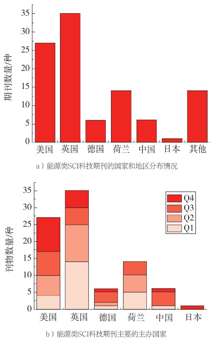能源类SCI科技期刊分布在不同国家和地区,但是绝大多数来源于美国、英国、德国、荷兰等科研水平较高的国家和地区。其中,英国的能源类SCI刊物数量排名第一,占能源类全部SCI刊物的33.98%;美国紧随其后,占全部的26.21%;中国有6种刊物入选SCI,占总数的5.83%。在办刊水平方面,英国、荷兰所办刊物以Q1区、Q2区为主,整体办刊质量很高;美国、德国的能源类刊物分布得较为均衡;中国和日本的能源类刊物主要集中在Q3区、Q4区,水平相对较低,简单来说,这是文章外流、语言因素共同作用的结果。