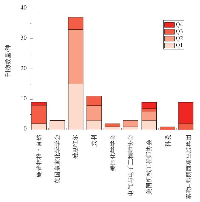 能源类SCI刊物中,由国际三大出版商(爱思唯尔、施普林格·自然、威利)运营的占全部刊物的55.34%。其中,爱思唯尔运营的刊物最多,共出版了37种能源类刊物,33种位于Q1、Q2区,整体办刊水平很高。此外,各大学会创办并运营的刊物数量也较多,占总数的14.1%,主要有英国皇家化学学会(RSC)、美国化学学会(ACS)、电气和电子工程师协会(IEEE)、美国机械工程师协会(ASME)以及美国物理学会(AIP)。这些学会创办的刊物水平也相对较高,多集中在Q1区、Q2区。