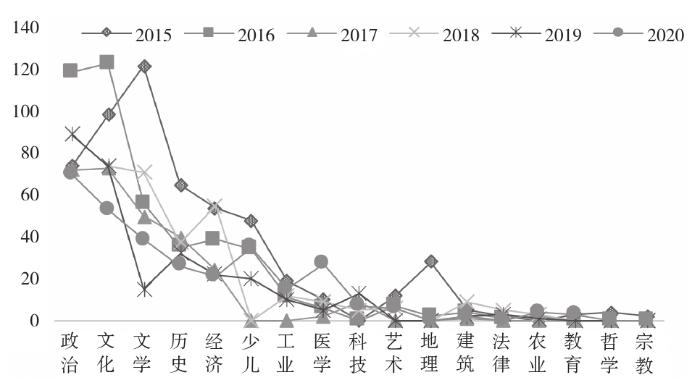 “丝路书香出版工程”资助的图书可分为17大类别,图书类型丰富多样。如图1所示,第一梯队为政治、文化两大类,具有绝对的数量优势,占比为45%;第二梯队为文学、历史、经济、少儿四大类,占比为42%,各类数量均超过100本;第三梯队为工业、医学、科技、艺术、地理、建筑、法律、农业八大类,占比12%,共265本;第四梯队为教育、哲学、宗教四大类,共12本,占比为0.5%。从出版年度来看,2015—2016年,图书类型数量波动起伏较大,资助类别以政治、文化类为主;2017年资助图书数量大幅减少,少儿、工业、艺术、地理等类图书数量为0;2018年各类图书数量逐渐均衡,政治、文化、文学类图书数量适当减少,科技、医学、农业类图书逐年增加;2020年,受新冠肺炎疫情的影响,资助侧重医学、工业、科技类图书。