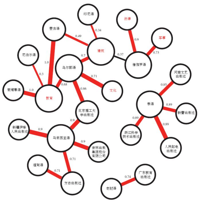 亚太地区、南亚地区。这两大地区与我国地理位置紧密相邻,同属“亚洲文化圈”,拥有天然文化联系。如图3所示,从语种和主题相关性来看,亚太地区图书翻译语种有7种(印尼语、蒙古语、柬埔寨语、马来西亚语、缅甸语、老挝语、泰语),明显高于南亚地区的3种(尼泊尔语、乌尔都语、僧伽罗语),柬埔寨语、蒙古语和教育类图书有1.0的极高相关,蒙古语和印尼语与建筑类图书相关性较低。南亚地区,乌尔都语、僧伽罗语和法律、军事、建筑、教育、文化类图书有极高或高度的相关性,尼泊尔语和教育类图书仅有0.3的低相关。从语种和出版社相关性观察,南亚地区涉及的语种不是出版社的最优选择,亚太地区的马来西亚语、缅甸语、老挝语、泰语是被选择较多的翻译语种,马来西亚语翻译图书分别和北京、新疆、吉林的3家出版社有较高关联,泰语翻译图书分别和河南、北京、浙江地区的出版社高度相关,老挝语翻译图书和广东教育出版社高度关联,缅甸语翻译图书仅和方志出版社高度关联。
