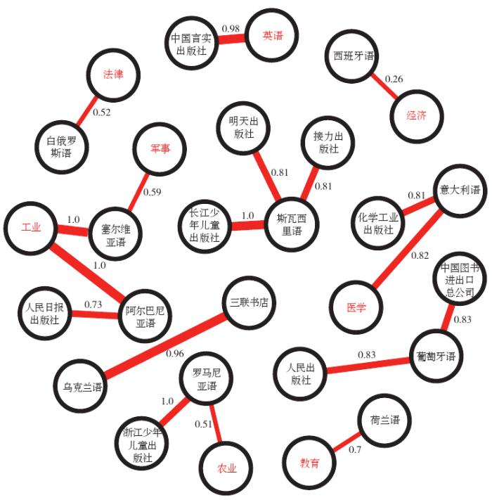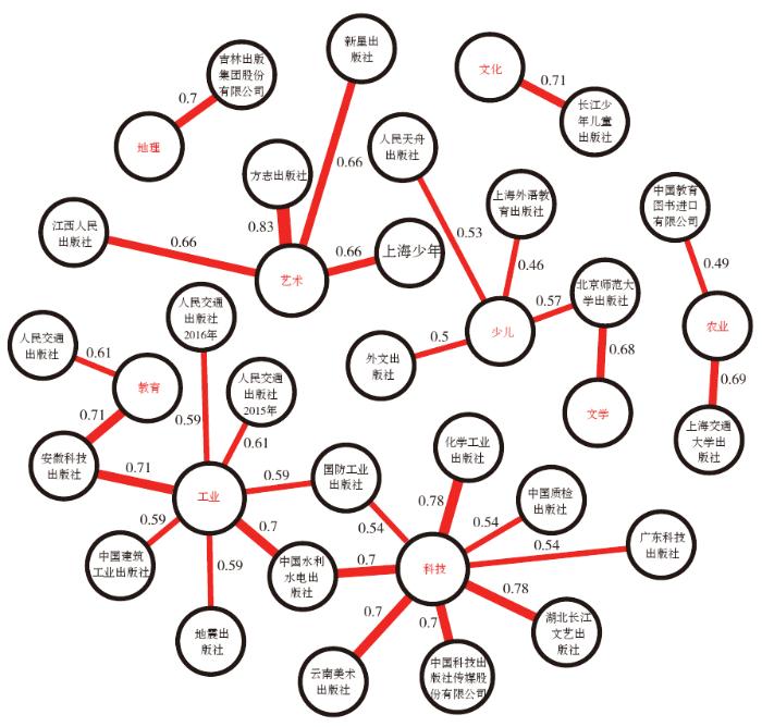 我国出版社对“一带一路”图书出版进行了诸多探索,截至2019年,已出版的以“一带一路”为书名的专题图书共453种[3]。如图6所示,科技、工业、少儿、艺术四大类别图书被多个出版社选择,科技、工业类图书和7家出版社均有较强相关性。值得一提的是,人民交通出版社2015年、2016年连续两年和工业类图书相关;艺术类图书和方志出版社具有0.83极强相关,与新星出版社、江西人民出版社、上海少年儿童出版社具有高度相关;少儿类图书和4家出版社具有中等相关性;农业类图书和上海交通大学出版社具有0.69高度相关,和中国教育进出口出版社降低为0.49中等关联;地理、文化、文学类图书仅和1家出版社具有关联度,皮尔逊系数均相对较高。