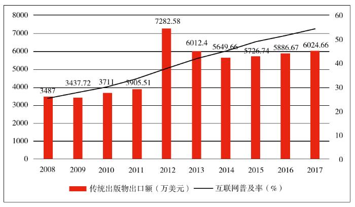 受限于统计数据的缺失,笔者仅对2008—2017年中国统计年鉴出口贸易数据和国际电信联盟统计的全球互联网数据进行综合分析,对我国传统出版物的出口贸易规模、出口贸易结构、出口区域特点等进行量化分析,详细说明互联网时代我国传统出版物出口贸易现状。