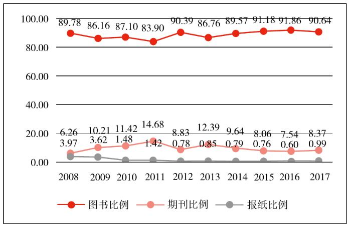 如图2所示,在2008—2017年我国传统出版物出口贸易类型中,图书出口所占比例最高,每年都在83%以上,总体呈现小幅度上升趋势,其中图书出版物出口所占比重最低年份是2011年,约83.9%;所占比重最高年份是2016年,约91.86%。占比第二位的是期刊,2008—2017年中国期刊出口占比平均约为9.74%,有小幅度的下降趋势。报纸出口所占比重位于第三位,2008—2017年中国报纸出口比重平均约为1.53%,所占比例一直较低,而且从2012年开始,报纸的出口比重一直低于1%。