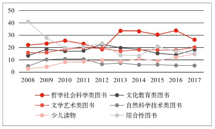 2008—2017年中国图书出口类型如图3所示,可以看出哲学社会科学类图书、综合性图书和少儿读物出口比重波动较大,文学艺术类图书、文化教育类图书和自然科学技术类图书出口比重波动较小。例如,2008年图书出口类型所占比重最高的是综合性图书,超过40%,少儿读物出口比重最低,不超过5%。但在2017年,综合性图书出口比重已经降到15%,与少儿读物所占比重持平。哲学社会科学图书出口比重在2012—2013年期间增长幅度较大(约15%),从2013年开始成为主要出口图书种类,然而2017年哲学社会科学图书出口比重有较大幅度的下降(约8%)。文学艺术类图书、文化教育类图书所占比重在这十年间波动幅度较小,总体呈现上升趋势,在2017年图书出口类型所占比重中分别位列第二、第三名。自然科学技术类图书所占比重虽然在2008—2011年有小幅度增长(约5%),但是在2012年下降至5%后便呈现稳定不变的趋势。