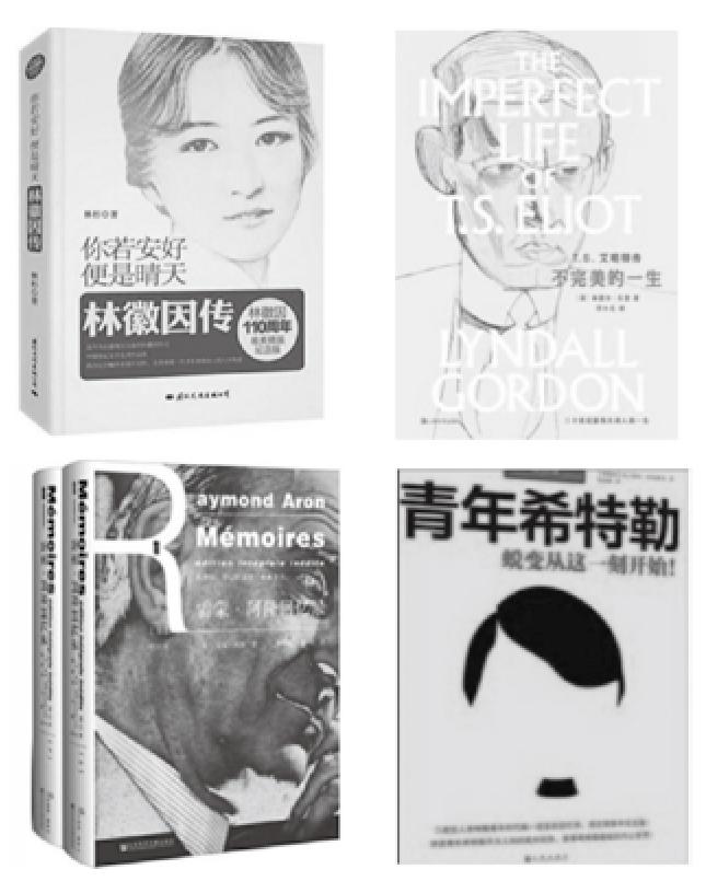 设计师、插画师、编辑等可以选取主人公较为个性化的造型,对其进行素描、漫画式处理,然后将插画作为封面配图,有助于催生耳目一新的“陌生化”设计,从而避免“刻板印象”的形成。插画属于再创作,不像照片那样拘泥于写实。林徽因传记的封面配图多选用传主青春时期的秀丽照片,但K社2014年出版的《你若安好,便是晴天:林徽因传》的封面配图为传主的素描,保持了清新、隽雅风格(如图6所示)只是该书包含“林徽因传”字样的色块略显“沉重”,不如适当淡化处理,以使整个封面的配色跳跃感不过于突兀。L社2019年出版的《T.S.艾略特传:不完美的一生》同样运用了插画,且插画与书名的字体、字号、颜色更为搭配,没有出现不协调的色块。M社2018年出版的《雷蒙·阿隆回忆录》和N社2014年出版的《青年希特勒》则提取主人公的侧影和标志性形象绘制插图,尤其是《青年希特勒》的封面插图,即便只勾勒出传主大致的发型和胡须,依然具有较高辨识度。