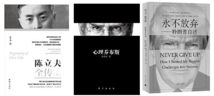 部分设计师、编辑偶尔会对封面人物的配图进行裁剪和出血处理,有时甚至只保留主人公的“眉目”部分,既使封面呈现出局部肖像的装饰效果,又增强作品的悬念。笔者曾在教学实践中做过随机测试,只展示O社2018年出版的《陈立夫全传》的封面局部肖像,同时遮蔽该封面上的文字,学生很难通过配图联想到传主身份,但乔布斯、特朗普等当代知名人物的传记作品,即便封面只截取“眉目”部分,依然容易辨认(如图7所示)。因而,设计师、编辑在裁剪图像时应考虑当代读者群体的接受能力和语境,才能使产品更好地对接目标受众。