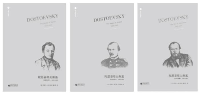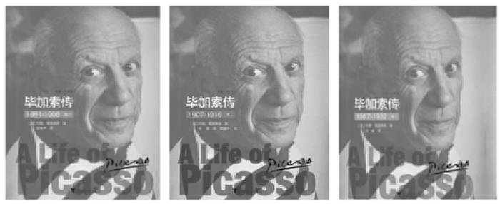 某些人物传记类图书含有多卷本,且不同卷次的出版时间不一,有的间隔长达数年。为了避免视觉上的审美疲劳,多卷本的人物传记类图书封面最好不要使用同一幅图像作为各卷的设计主图。例如,P社自2016年起出版的《毕加索传》,迄今已出版了前3卷,尚未出齐,该套书的封面配图均是同一幅毕加索的特写照,略显重复、单调(如图8所示)。而Q社近年来陆续出版的多卷本传记《陀思妥耶夫斯基》,各卷封面配图便有所变化,在维系封面整体风格一致的前提下,赋予各卷新的信息和内涵(如图9所示)。R社2016年出版的《乔伊斯传》(3卷本),同样以简笔素描作为封面插图,该书所附“别册”则收录许多传主的照片、手稿等。人物传记类套书各卷次所记述的内容往往对应主人公某一时期的生平经历,因而可选取不同年代的主人公肖像作为不同卷次的封面配图,更好地呼应各卷的内容。