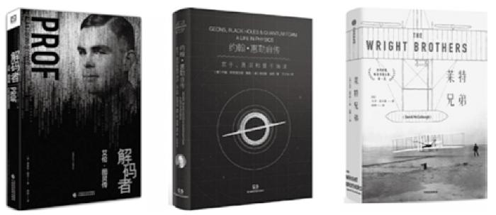随着时代的发展,当今学科门类更为细化和多元,且不同学科有着自身的范式、话语体系和象征符号,这为人物传记类图书封面配图提供了更多选择。例如,科技人物传记的封面设计能较好地融入科技元素。艾伦·图灵有“计算机科学之父”“人工智能奠基者”之称,S社2017年出版的《解码者:艾伦·图灵传》的封面将主人公的肖像与纵向排列的代码流叠置(如图10所示)。与单独配用传主的肖像相比,加入代码元素的封面更能呼应作品内容。作为相对论天体物理学的开拓者,美国物理学家约翰·惠勒不但对黑洞深有研究,还提出了“量子泡沫”“虫洞”等概念,T社2018年出版的《约翰·惠勒自传:京子、黑洞和量子泡沫》的封面采用了抽象化的天体图案来寓意约翰·惠勒的科研成就,同时把他的肖像缩小,放置在书脊的下方,以便图书上架后仍能呈现主人公的形象,且不与封面配图重复。U社2019年出版的《莱特兄弟》的封面选用了简明的飞机平面示意图,强烈地暗示出该书与飞机制造相关。