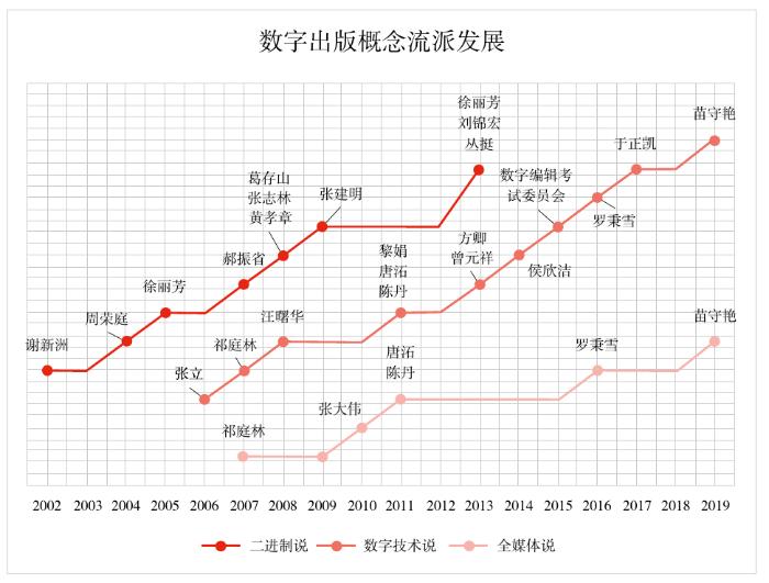 2002—2006年,集中研究数字出版概念的学者比较多,如周荣庭、却咏梅、徐丽芳、张立等,因此促成了“数字出版”的提法被列入国民经济和社会发展“十一五”规划纲要。2010年,数字出版概念的规定性内涵,由原国家新闻出版总署系统地提出并作解释。此后,一直到2019年,学界持续研究数字出版概念的热情仍然没有消退,学者们纷纷试图从不同的维度对“数字出版究竟是什么、数字出版包含什么”两个问题作出解答,也就是对数字出版的内涵和外延作出界定和梳理。