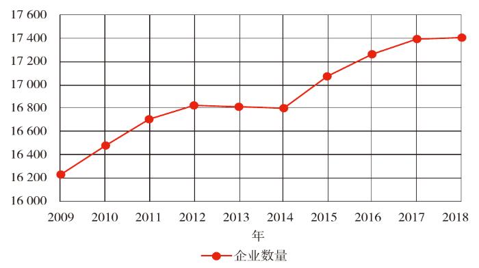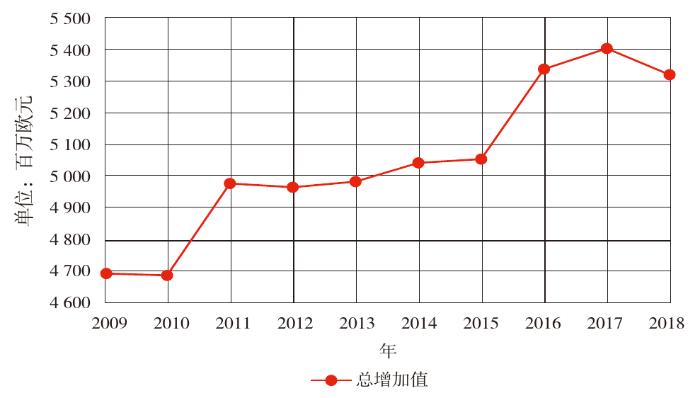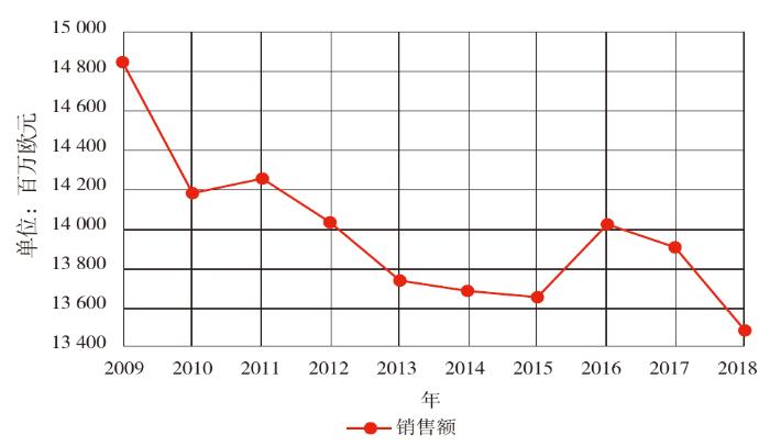 近十年间的德国图书市场发展数据表明,德国图书市场呈现出挑战与机遇并存的现状。图书市场销售额和增加值的变化趋势如图1、图2所示。一方面,2009年至2018年行业总销售额出现了明显的下降趋势,下降幅度近10%,这表明图书市场整体上出现了萎缩的问题,行业的发展处于衰退期。正如有学者指出,从过去十年的出版业数据来看,德国出版业呈波动式前进,但这一曲线呈明显的下降趋势。[1]另一方面,行业增加值增长趋势显著。