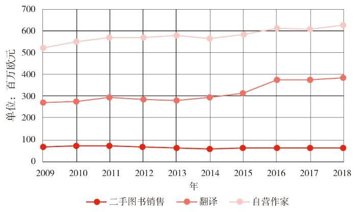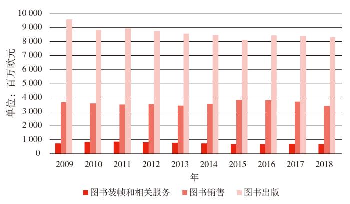 在具体的产业领域方面,以图书装帧、销售为代表的传统领域呈现明显的衰退趋势(如图6所示)。十年间产业销售额下降了近一成,图书装帧行业销售额从2009年的7.32亿欧元下降到2018年的6.8亿欧元,降幅超过7%;图书销售行业销售额从2009年的近37亿欧元下降到2018年的34亿欧元,降幅也近7%;图书出版行业销售额从2009年的近96亿欧元下降到2018年的83亿欧元,降幅超过13%;同期,二手图书的销售额虽然相对保持了较为稳定的变化趋势,但也从0.66亿欧元下降到0.61亿欧元,降幅也近7%。