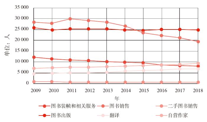图书市场的数字化转型,冲击了对于图书作品出版发行进行渠道控制而获得利润的商业模式,作品创作者能够通过数字化的平台、交易渠道直接面对终端消费者。因此,图书作品的传播和交易,不再高度依赖于传统的图书制作、装帧技术,以及书商主导下的图书交易模式。通过控制图书市场各个环节、渠道而获益的商业模式受到了冲击。特别是图书市场人力资源分布的变化趋势显示,以翻译和自营作家代表的内容创作领域从业者人数剧增,表明图书市场的重心正在由渠道控制向内容创作回归。这意味着在国家产业政策、信息技术的影响下,文化与知识的传播没有因为产业的衰退而减速,相反在新的载体和传播方式影响下,控制传播渠道和传播载体的商业模式日渐式微,内容的创作再次成为图书市场发展核心动力。