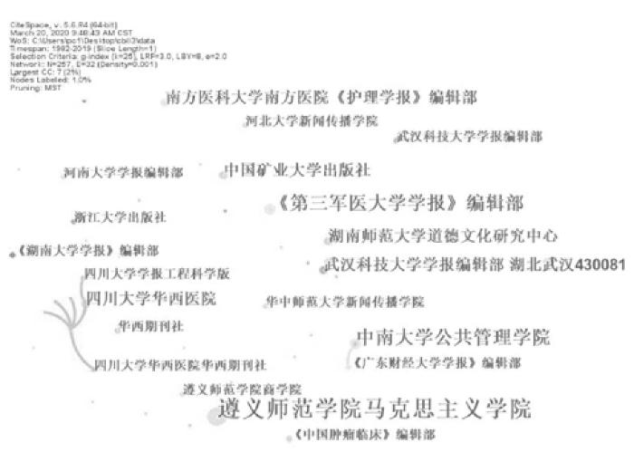 通过对出版伦理研究的机构合作网络图谱进行分析,可以了解重要发文机构的分布及相互合作情况。出版伦理研究机构合作网络图谱见图3。该合作图谱共包括257个节点,说明246篇文献共涉及257个研究机构,其中发文量大于3篇的共有8家,总发文量29篇,排名前三位的机构分别是遵义师范学院马克思主义学院(6篇)、中南大学公共管理学院(4篇)、《第三军医大学学报》编辑部(4篇)。该图谱包含32条连线,说明机构之间的合作达到32次,其中合作最密切的是四川大学华西医院、四川大学华西医院华西期刊社、四川大学学报工程科学版等,其次是中南大学公共管理学院、《广东财经大学学报》编辑部。由此可以看出,一方面,与作者合作共现图谱相似,国内出版伦理研究的机构合作共现图谱网络密度也仅达到0.001,说明机构分布较为分散,机构之间的合作强度较低;另一方面,机构之间的合作多为机构内部组织之间的相互合作,机构与机构之间的合作仍有待进一步加强。