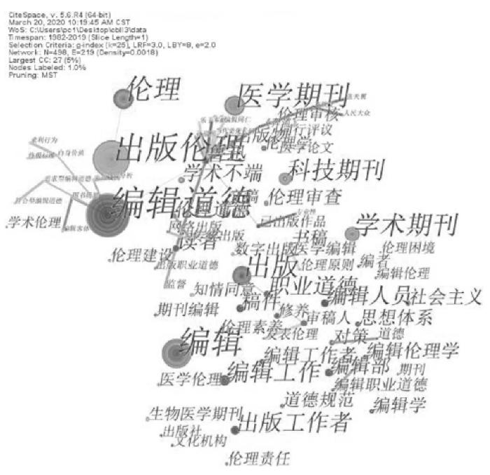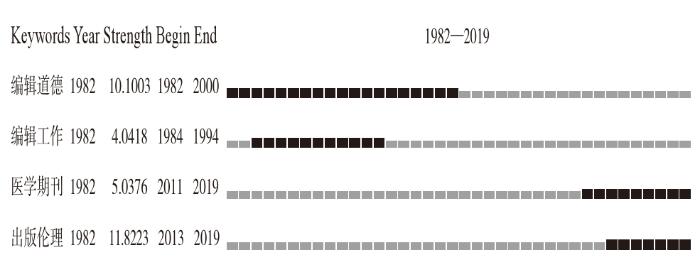 突显词是某一相关领域较短时间内使用频次较高或出现次数较多的词,通过对突显词进行分析,可以在一定程度上判断该领域的研究前沿热点与预测研究趋势。根据CiteSpace相关分析,我们得到了出版伦理研究领域的突显词及对应的凸显率和被引历史(见图6)。“编辑道德”“编辑工作”“医学期刊”“出版伦理”代表着不同时期出版伦理研究领域的热点,其中关于“编辑道德”方面的研究主要集中在1982—2000年,关于“编辑工作”方面的研究主要集中在1984—1994年,关于“医学期刊”方面的研究主要集中在2011—2019年,关于“出版伦理”研究主要集中在2013—2019年,说明目前我国科技期刊出版伦理研究趋势经历了以编辑道德、编辑工作为主向以医学期刊、出版伦理为主的转变。