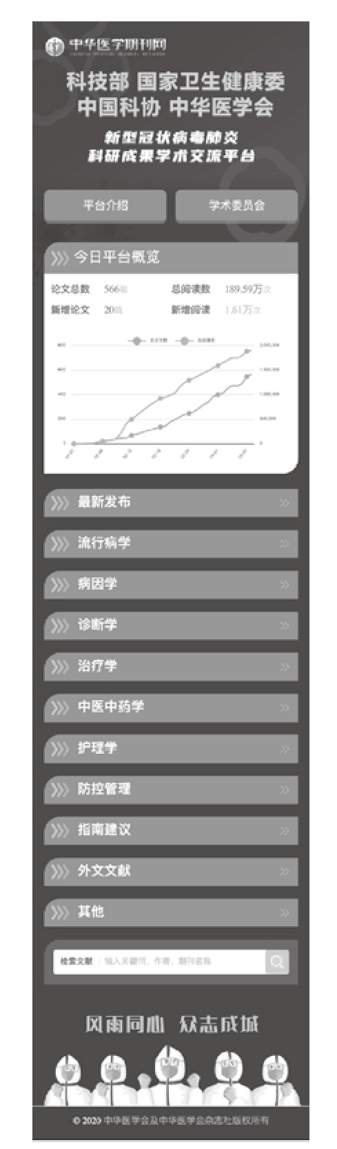 升级后的"新型冠状病毒肺炎科研成果学术交流平台"手机端首页