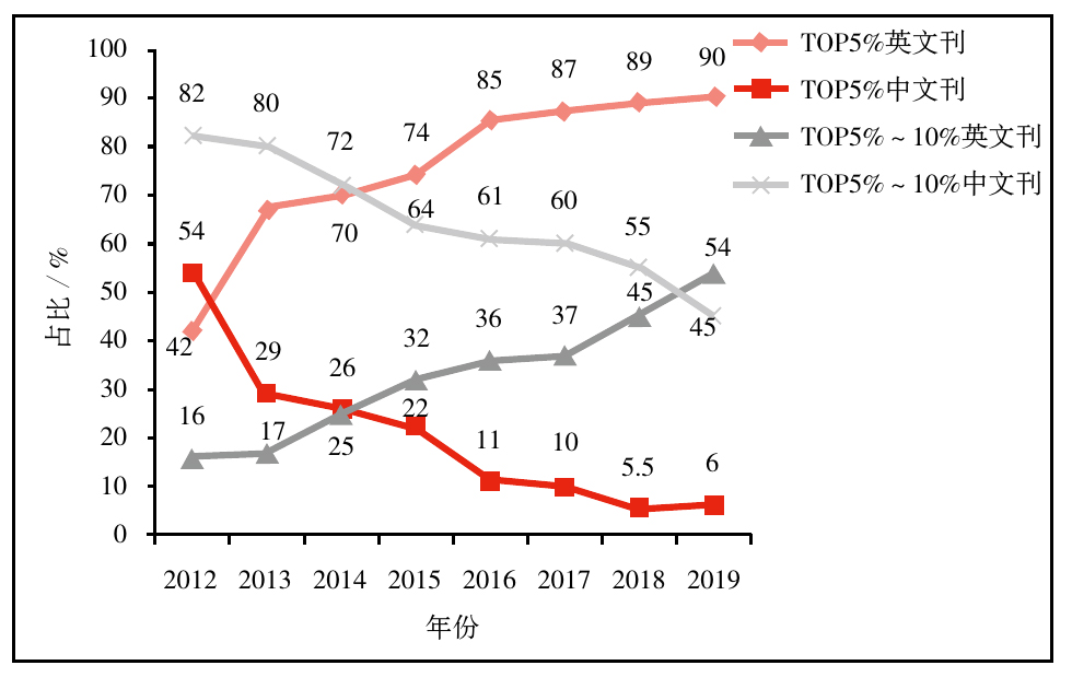 2012—2019年2类高校TOP科技期刊的语种分布统计结果