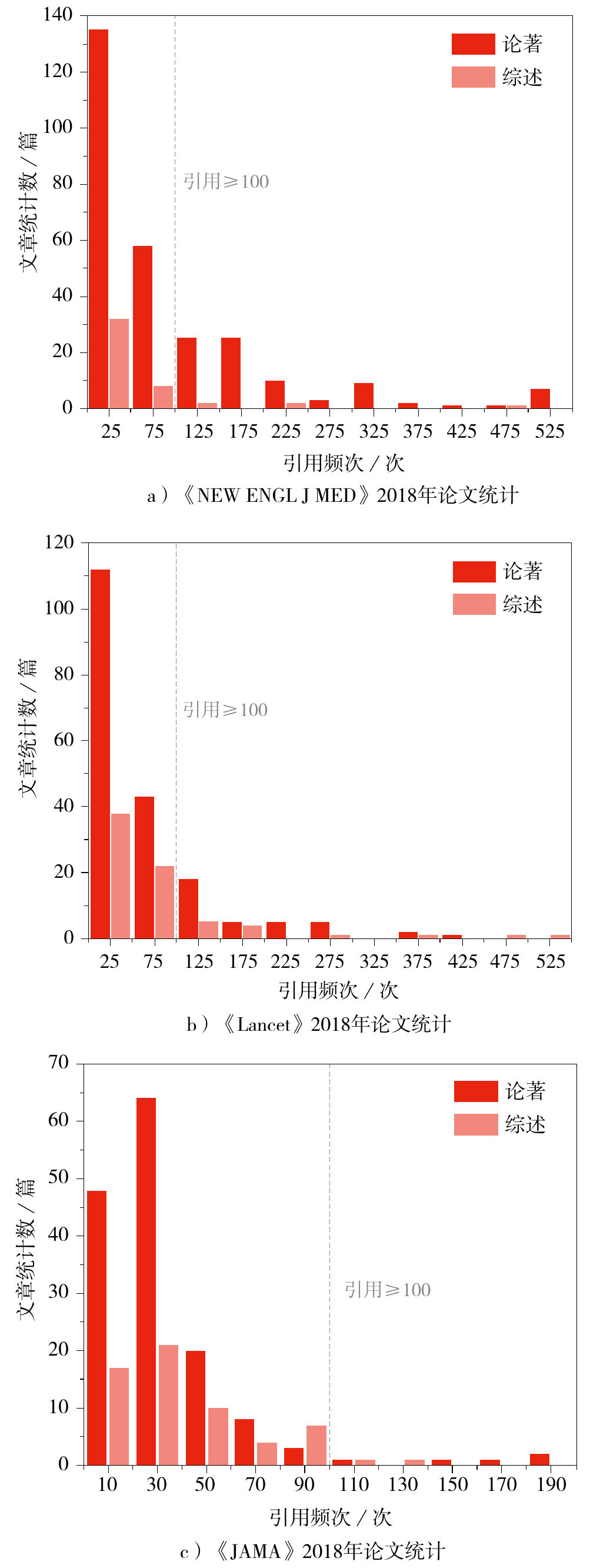 3种医学综合类期刊于2018年发表的论著和综述的被引频次分布图