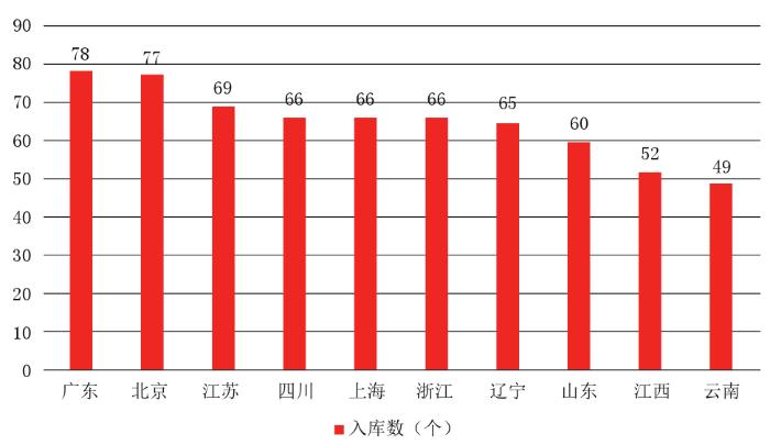 从申报单位所在省份来看,入库数量排名前10的省份(自治区、直辖市)依次为:广东省、北京市、江苏省、四川省、上海市、浙江省、辽宁省、山东省、江西省和云南省。这10个省份的入库项目总数为648个(见图1),占中央单位外所有入库项目的48.2%。