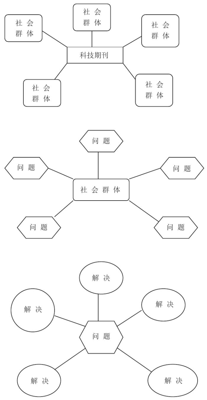 要提高社会效益,使科技期刊的产出达到所期望的社会效果,在微观上要着力解决“相关社会群体”(relevant social group)的“问题”(problem),而要解决“问题”,就需要提供相应的解决方案(solution)。期刊同仁可以借鉴社会建构论的观点,“多向模式”地提供知识服务(见图2),助力“相关社会群体”解决“问题”,提高期刊的社会效益。