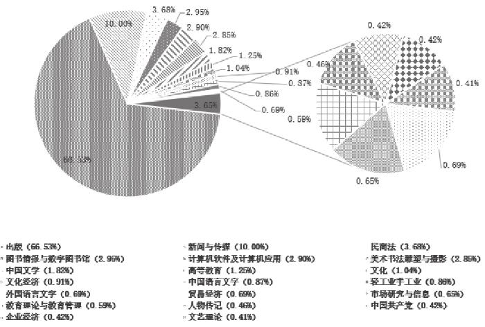 分析核心刊物文献的研究方向分布,可得到我国出版学的宏观版图。通过对上述文献数据进行归类分析,然后利用Excel进行绘图,得到研究方向百分比饼状图(见图1)。在统计的文献中,出版学占比最高(66.53%),其次为新闻与传媒(10.00%),其余依次为民商法(3.68%,大部分为知识产权)、图书情报与数字图书馆(2.95%)、计算机软件及计算机应用(2.90%)等。可见,各刊始终坚持以出版学科为主要阵地,融合多学科办刊,一方面坚持出版学的主体性,另一方面兼顾跨学科性。