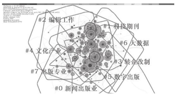将文献数据清洗之后,导入CiteSpace,并选择年度切片为1,每个切片选取前20%关键词进行数据可视化,再进行聚类分析并采用“LLR”算法进行命名,获得关键词聚类图(见图2)。从图2选取数量最多的八类关键词(对应序号0-7)。这些关键词体现了产业关注的若干方面,其按照算法结果的数量排序依次包括:第一类为新闻出版业类,主要涉及出版强国、阅读推广、出版体制改革、软实力提升等;第二类为科技期刊类,主要包括科技期刊和学术期刊的学术影响、高校学报改革、学术质量提升等;第三类为编辑工作类,主要涉及图书出版、图书质量、选题策划、读者服务、编辑加工等;第四类为转企改制类,关注出版社以及出版企业的改革;第五类为文化产业类,在产业的角度探讨出版高质量发展、“走出去”等;第六类为数字出版类,在出版产业内部研究数字出版密切关联的商业模式、媒体融合等;第七类为大数据类,探讨出版周边与媒介大数据相关的微博、互联网广告等;第八类为出版专业类,例如职业类资格考试等。
