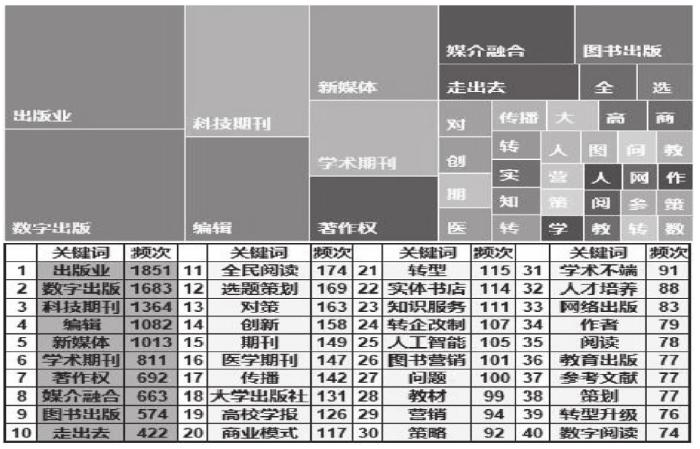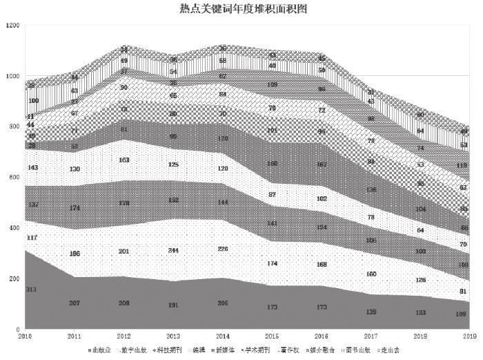 笔者利用Python从文献数据中提取关键词以及发表时间的数据,建立“关键词-时间演化表”,提取词频排名前40的关键词,并绘制数量比例树状图(见图3)。如图3所示,这些关键词形成了三个梯队:第一梯队为出版业、数字出版、科技期刊、编辑、新媒体,各关键词频次均高于1 000次;第二梯队为学术期刊、著作权、媒介融合、图书出版、走出去,频次介于400~820次;剩余关键词为第三梯队,频次皆低于200次。较为显著的是,第一梯队和第二梯队的关键词囊括了频次排名前10位的关键词,与第三梯队的关键词在数量上差距较为明显。这些关键词除了编辑、科技期刊、学术不端等研究出版编辑相关业务问题之外,均聚焦于出版产业亟须解决的重大问题,围绕出版业转型升级展开。由此可反映出版业的发展境况:首先,出版业面对互联网的冲击,必须努力寻求对策,例如向数字出版转型,融合新旧媒介,寻求知识服务等商业模式的创新,迎接全民阅读的挑战等;其次,在转企改制的大背景下,编辑出版行业在科技期刊、学术期刊、大学出版社、高校学报、教材出版等领域谋求创新,以寻求转型升级,并力求依托“一带一路”等国家战略“走出去”。